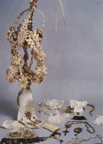 Libros de doctrina, catecismos, premios, trajes de primera comunión, misales, rosarios, bandas, recordatorios, etc.